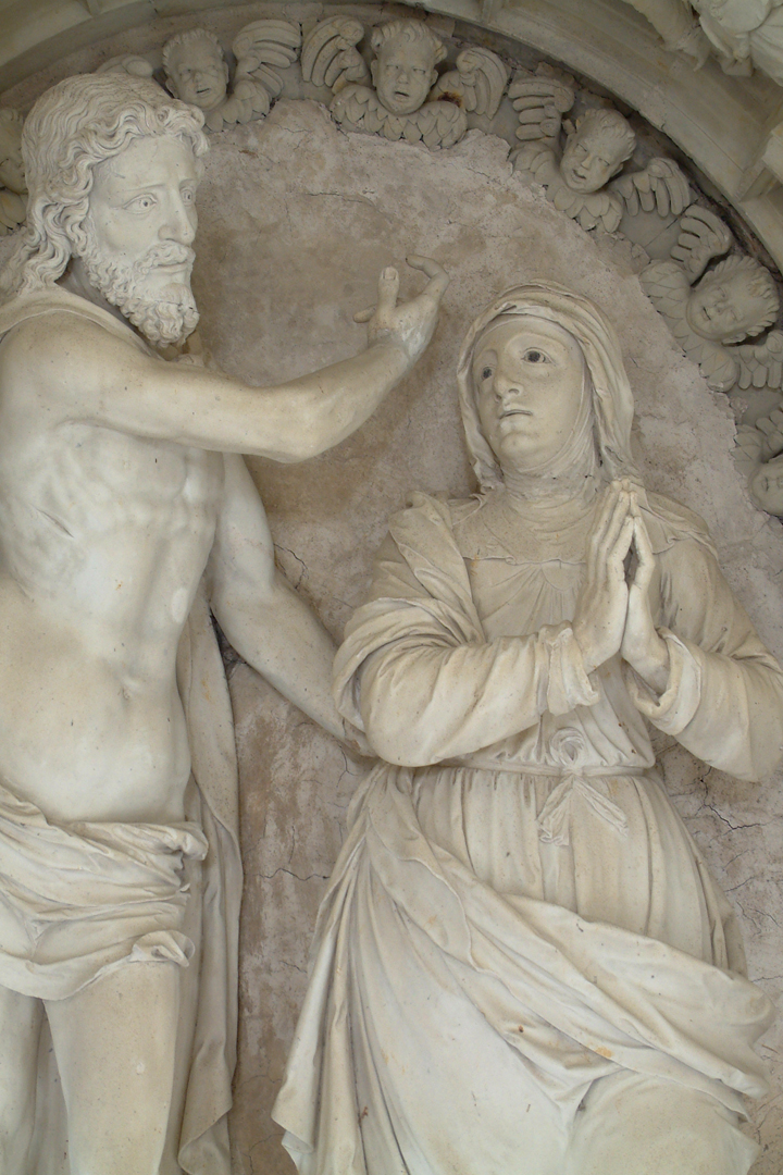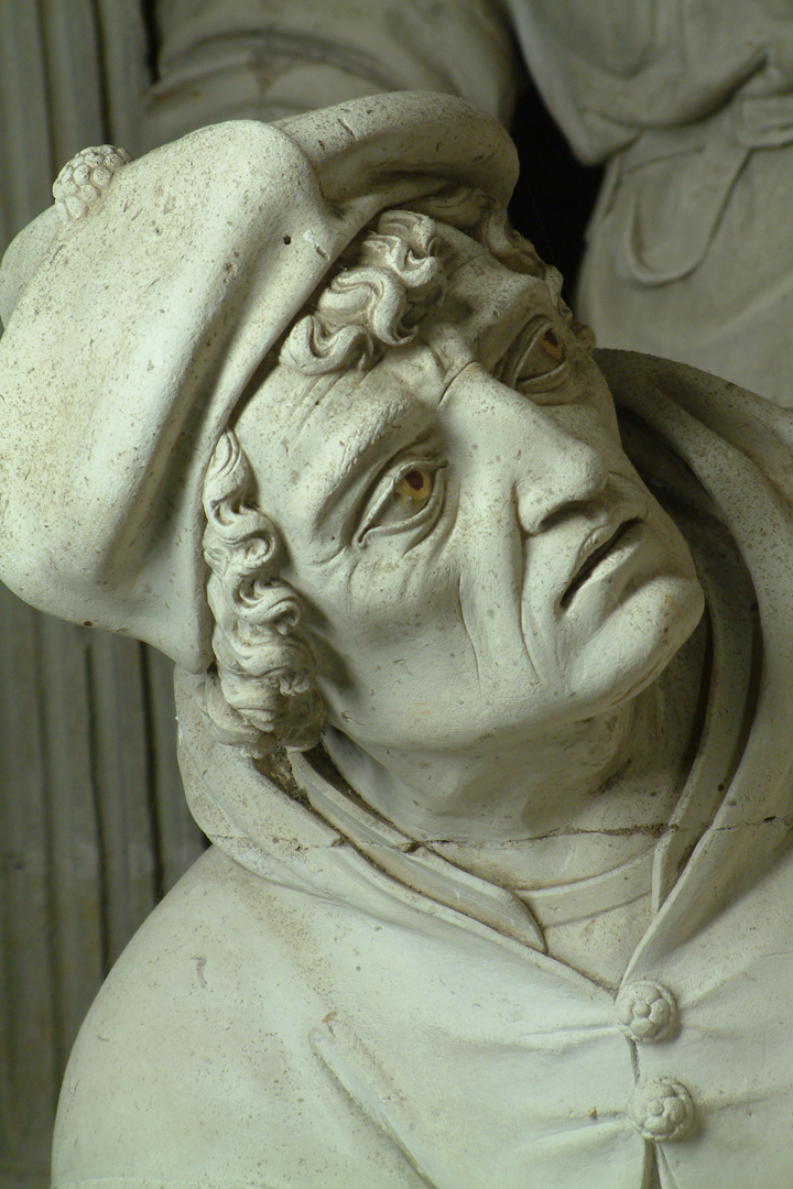 Le mur ouest, enfin, ne porte qu'un ensemble, au registre supérieur, représentant Jésus au milieu des docteurs. D'après les évangiles, alors que Jésus avait douze ans, il resta à Jérusalem à l'issue du pélérinage annuel. Revenant sur leurs pas, Marie et Joseph le trouvèrent au Temple, en discussion avec les docteurs (Lc 2, 41-52). L'artiste a malicieusement représenté ceux-ci sous les traits des principaux réformateurs du XVIe siècle.